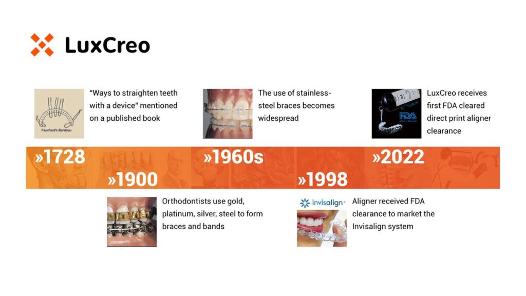 - In 2022, a pivotal transformation occurred with LuxCreo receiving the first FDA clearance for direct print aligners, marking the introduction of directly 3D printed aligners. This breakthrough eliminated the need for physical models entirely, enabling full chairside production and closing the loop on digital dentistry. Unlike the conventional indirect thermoforming technique that requires model production, direct 3D printing fabricates aligners directly using biocompatible clear resins, representing the most significant advancement in clear aligner manufacturing since their initial introduction.